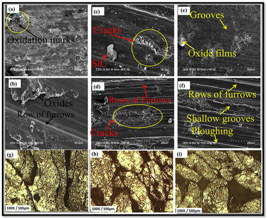 SEM micrograph of worn-out surfaces of Mg /SiC (a) Mg/SiC for 0.4 m/s at 5 N, (b) Mg/SiC for 0.4 m/s at 10 N, (c) Mg/SiC for 0.6 m/s at 5 N, (d) Mg/SiC for 0.6 m/s at 10 N, (e) Mg/SiC for 0.8 m/s at 5 N, and (f) Mg/SiC for 0.8 m/s at 10 N [109]. (g–i) Optical characterization of TiC-reinforced (3 wt.%, 6 wt.%, and 9 wt.%) magnesium composites [111].