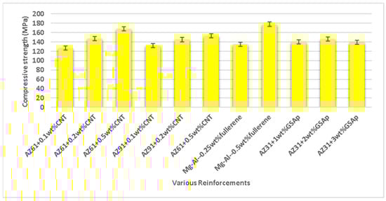 Turan et al. [144] analyzed the mechanical and corrosion characteristics of a magnesium (Mg-1wt.%Al) alloy reinforced with fullerene (0.50 wt.%) formed via powder metallurgy. Bragg’s diffraction peak (resembling hexagonal Mg phase) is around 15o to 75o, confirming the existence of fullerene in a Mg alloy. Field emission scanning electron microscopy (FESEM) shows no macrostructural defects appearing on the surface of the magnesium alloy reinforced with fullerene. The homogeneous dispersion of fullerene in the magnesium alloy matrix is present without the appearance of defects or cracks with fullerene. The mechanical behavior of the composite, i.e., Vickers hardness (56 Hv), ultimate compressive strength (296 MPa), and compressive failure strain (15.72%), appeared to be enhanced with fullerene. The wear rate of the composite was assessed across sliding velocity (48 mm/s and 96 mm/s) and applied load (5 N, 10 N, and 20 N) values. The wear resistance was increased with the addition of fullerene to the composite. The corrosion resistance of the composite was enhanced with fullerene in the magnesium alloy. Say et al. [145] analyzed the mechanical and corrosion characteristics of the magnesium alloy (AZ91 and AZ61) reinforced with carbon nanotubes (CNTs) (0.1 wt.%, 0.2 wt.%, and 0.5 wt.%) formed via powder metallurgy. XRD confirmed the presence of the β-Mg17Al12 phase in the magnesium alloy. The compressive strength and yield strength increased with carbon nanotubes for the AZ31 alloy composite (Figure 10). The yield strength of the AZ91 alloy composite was decreased, whereas the compressive strength was increased with the addition of carbon nanotubes to the composite. A continuous increase in the porosity and reduction in ductility was observed for magnesium alloy composites (AZ61 and AZ91) with the addition of carbon nanotubes.