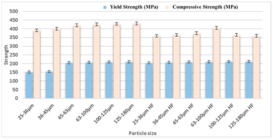 The particle size of the reinforcement and matrix affects the surface morphology and mechanical behavior of Mg-based material formed using the powder metallurgy approach. The strength and porosity of the composite material are directly related to the reinforcement and matrix particle size [150,151,152,153,154,155]. Further, the size of the void developed in the composite material influences the strength and porosity of the composite material, which is critical to examine [156,157]. Dvorsky et al. [158] analyzed the effects of particle size on the corrosion resistance and mechanical characteristics of WE43 (Mg-4Y-3REE-Zr) alloy and WE43 (Mg-4Y-3REE-Zr) reinforced with HF composite. The mechanical characteristics of the alloy and composite components were varied, along with the particle size, i.e., 25–36 µm, 36–45 µm, 45–63 µm, 63–100 µm, 100–125 µm, and 125–180 µm. The yield strength of the alloy and composite was enhanced with an increase in the particle size; however, the ultimate compressive strength of the alloy increased up to 100–125 µm and then decreased with an increase in particle size up to 125–180 µm. The ultimate compressive strength of the composite was increased initially up to 63–100 µm but then decreased with an increase in particle size up to 125–180 µm. The ultimate tensile strength of the alloy increased with the increase in particle size. Still, the ultimate strength of the composite increased up to 63–100 µm, and then there was a sudden reduction in ultimate tensile strength with an increase in particle size of up to 125–180 µm. The ductility (%) of the alloy and composite was enhanced with the particle size. The corrosion resistance of the alloy and composite was reduced with the increase in particle size. The ignition temperature of the alloy was decreased with an increase in the size of the particles. Rahmani et al. [159] analyzed the effects of the matrix particle size on the mechanical characteristics of a magnesium alloy (AZ91) reinforced with B4C (5 wt.%, 10 wt.%, 15 wt.%, and 20 wt.%) formed via powder metallurgy. The particle size of the matrix was taken as 10 µm and 60 µm to form an AZ91/B4C composite. The porosity of AZ91 with a particle size of 60 µm reinforced with different percentages of B4C was observed to be lower than that of AZ91 with a particle size of 10 µm reinforced with varying percentages of B4C. Therefore, the density and microhardness of the composite appeared to be higher for the matrix material with a particle size of 60 µm than the matrix material with a particle size of 10 µm. The influence of particle size of reinforcement on the mechanical properties of the composite is shown in Figure 12.