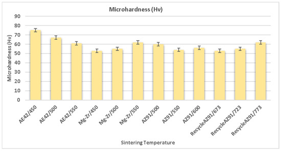In the sintering process, the diffusion of the material occurs in pores that enable the chemical and physical bond at the surface interface of reinforcing and matrix powder material, which improves the strength of the composite material. The research suggests that the diffusion of material varies with temperature and time and illustrates that the sintering time and sintering temperature determine the diffusion and expansion rate of powder materials in the composite [169,170,171,172,173,174,175]. The literature shows that a suitable sintering time also enhances the strength of the composite. Zhou et al. [176] analyzed the effects of the sintering temperature on the mechanical characteristics of the AZ91 alloy by varying the sintering temperature, i.e., 450 °C, 500 °C, 550 °C, and 600 ºC. The hardness, tensile strength, and density are observed to increase up to 550 ºC, but beyond that temperature, there exists a reduction in mechanical characteristics due to an increase in porosity that generates tiny holes in the alloy sample. The microstructure depicted that the β-Mg17Al12 phase was distributed around the grain boundaries that enhance the resistance to corrosion characteristics of the alloy. The β-Mg17Al12 and α-Mg phases were obtained in white and gray matter distributed along the grain boundary. Minarik et al. [177] analyzed the effects of the sintering temperature on the mechanical characteristics of the AE42 magnesium alloy by varying sintering temperatures, i.e., 400 °C, 450 °C, 500 °C, and 550 °C. The microhardness of the alloy was observed to decrease with the increase in the sintering temperature due to grain growth. The increase in the sintering temperature was shown to result in the loss of mechanical characteristics of the alloy due to an increase in grain size. Annur et al. [178] analyzed the effects of the sintering temperature (580 °C and 630 °C) on the mechanical characteristics of an Mg-Zn-Ca alloy and an Mg-Zn-Ca/carbamide composite prepared via PM. The XRD image showed the MgO phase in all samples of the Mg-Zn-Ca alloy at all sintering temperatures, and the CaO phase was obtained in all the samples of the Mg-Zn-Ca/carbamide composite at all sintering temperatures. The compressive strength of the composite decreased at sintering temperatures beyond 580 °C in all samples due to an increase in porosity. SEM confirmed that high sintering temperatures resulted in higher porosity, which reduced the mechanical characteristics. Burke et al. [78] analyzed the effects of the sintering temperature on the mechanical characteristics of a magnesium alloy (AZ31) formed via powder metallurgy at varying sintering temperatures, i.e., 500 °C, 550 °C, and 600 °C. The small dimensional changes occurred in the sample subject with an increase in sintering temperature due to an increase in densification. The theoretical density and Rockwell hardness of the magnesium alloy were reduced with an increase in the sintering temperature (Figure 13).