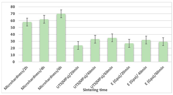 Gunes et al. [216] analyzed the effects of sintering time on the tribological characteristics of magnesium by varying the sintering time (2 h, 4 h, and 6 h) at a sintering temperature of 600 °C. The X-ray diffraction (XRD) image showed MgO, MgO2, and Mg compounds after sintering of Mg at 600 °C. The wear rate of magnesium was observed to decrease with an increase in the sintering time. Similarly, the corrosion resistance increased with an increase in sintering time and increased by 36% at a 6 h sintering time compared to a 2 h sintering time. The surface roughness of magnesium was observed to decrease with an increase in sintering time, with a value of 2.47 µm obtained at a 6 h sintering time. The microhardness was observed to be increased with an increase in sintering time, and a value of 75 Hv at a 6 h sintering time was obtained. The continuous reduction in porosity was observed with an increase in the sintering time. Kumar et al. [77] analyzed the effect of sintering time when recycling AZ91 magnesium alloy formed via powder metallurgy by varying the sintering time at values of 1 h, 1.5 h, and 2 h. The theoretical density of the composite was enhanced with an increase in the sintering time. The optimum value to recycle AZ91 magnesium alloy was 2 h. Burke et al. [78] analyzed the effects of sintering time on the mechanical characteristics of magnesium alloy (AZ91) formed via powder metallurgy by varying the sintering time, i.e., 20 min, 40 min, and 60 min. The theoretical density of the magnesium alloy increased with a sintering time of up to 40 min, but beyond that time, there exists a reduction in the theoretical density of the magnesium alloy. The hardness of the magnesium alloy was reduced by increasing the sintering time. The mechanical characteristics, i.e., ultimate tensile strength and elastic modulus, increased with a sintering time of up to 40 min, but beyond that time, there is a reduction in the mechanical characteristics with the increase in sintering time. The influence of sintering time on the mechanical properties of the composite is shown in Figure 14.