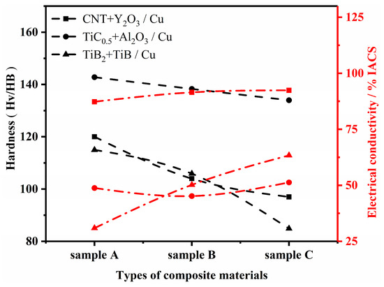 Comparative change curves of mechanical and electrical properties of conventional dual-phase reinforced CMCs literature study. (“▘” stands for the composite CNT+Y2O3/Cu, Samples A through C, respectively: 120 Hv, 87.3% IACS; 104 Hv, 91.5% IACS; 97 Hv, 92.4% IACS [18]. “●” stands for the composite TiC0.5+Al2O3/Cu, Samples A through C, respectively: 142.8 Hv, 48.8% IACS; 138.3 Hv, 45.2% IACS; 134 Hv, 51.3% IACS [19]. “▲” stands for the composite TiB2+TiB/Cu, Samples A through C, respectively: 115 HB, 30.9% IACS; 105.9 HB, 50.2% IACS; 84.9 HB, 60.4% IACS [20]).