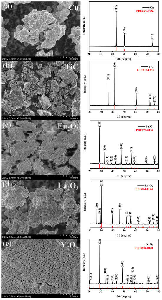 The raw materials used in the experiments included pure Cu powder (Approx. 45 microns), Eu2O3 powder, La2O3 powder, Y2O3 powder (1–3 microns) with a purity of 99.9%, and TiC powder (5–7 microns) with a purity of 99.99%. The experimental drugs were obtained from Shanghai, China (Shanghai Macklin Biochemical Technology Co., Ltd.). NOVA NANOSEM 230 scanning electron microscope (SEM: FEI Company, Columbia, MD, USA) and D8 ADVANCE X-ray diffractometer (XRD: Voltage 30 Kv, Current 10 mA. Scanning angles from 20° to 80° at a rate of 10°/min. Bruker Corporation, Saarbrücken, Germany) were utilized for morphological observation and elemental determination of the pristine powders, which are shown in Figure 2. From the SEM images, it is observed that the matrix powder is nearly spherical without obvious agglomeration, and the TiC and Re2O3 are irregularly shaped. The main peak positions and PDF card parameters of the pristine phase were obtained from the XRD plots, and no lattice distortion of the pristine phase was found. The collection of these test results facilitates the observation of the changes in the morphology, size and crystal structure of the matrix powder after ball milling. The ball-to-material ratio was set at 10:1, and in order to prevent agglomeration from occurring during the ball milling process, anhydrous ethanol of 99.9% purity was used as the dispersion control agent, and Sample 0 (Cu), Sample 1 (TiC/Cu), Sample 1-1 (Eu2O3-TiC/Cu), Sample 1-2 (La2O3-TiC/Cu), and Sample 1-3 (Y2O3-TiC/Cu) were successfully prepared, and the sample dosing ratio is shown in Table 1.
