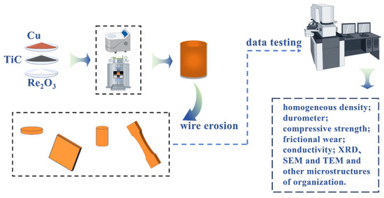 The flow of experiment and test analysis is shown in Figure 3. A QM-QX4 planetary high-energy ball mill was used, with a set rotational speed of 400 r/min and a time of 6 h. The mixed composite powders were transferred to ZT-40-20Y vacuum hot-pressing sintering furnace, with a set heating rate of 10°/min, a target temperature of 850 ℃, a load of 50 MPa, and an insulating pressure holding time of 1 h. The target specimens were obtained after sintering. The specimen was processed into standard size according to the test requirements using a wire cutter, and the surface of the specimen was polished to a flat and smooth surface with the help of sandpaper and YM-2A polishing machine. The composition of the corrosion solution: a mixture of dilute hydrochloric acid and dilute nitric acid. Finally, the friction coefficient, hardness, density, compression properties and electrical conductivity of the composites were tested and analyzed by MMW-1 friction and wear tester, HR-150A Rockwell hardness tester, ML204T/02 density analyzing balance, CMT5105 universal tester, and ST2263 vortex conductivity tester; and D8 ADVANCE X-ray diffractometer and metallurgical microscope were used, D8 ADVANCE X-ray diffractometer, metallurgical microscope, NOVA NANOSEM 230 Field Emission Scanning Electron Microscope, Tecnai G2 F30 Transmission Electron Microscope (TEM: FEI Company, Columbia, MD, USA)and other instruments to test and analyze the composite powder and material for elemental species and micro-morphology.