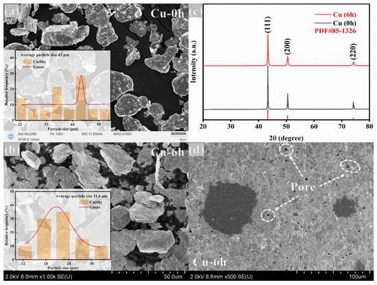 Figure 4 shows the characterization test set of pristine pure Cu. From Figure 4a,b, it can be seen that the morphology of Cu particles is affected by the high-energy ball milling process, and the matrix particles are subjected to intense collision and extrusion, which transforms the original near-spherical morphology into flat flake and flat sphere morphology, and the average size is significantly reduced. Combined with the particle size distribution graph and the XRD diffraction peaks of Cu—6 h in Figure 4c, compared with those of Cu—0 h, the peak intensity is significantly reduced, and the peak broadening phenomenon obviously occurs, indicating that ball milling destroys the original crystal structure of the matrix, resulting in a decrease in the degree of crystallinity and grain refinement, which is corroborated by the intuitive results of Figure 4a,b. Observation Figure 4d reveals that the sintered material has more pores, which is due to the lower stacking efficiency [31,32] of flat lamellar and flat spherical particles compared to near-spherical particles, which is more likely to form pores during sintering.