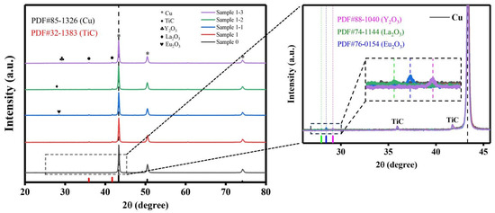 Figure 5 shows the XRD comparison curves of each specimen powder after 6 h of ball milling. Referring to the PDF standard card, it can be obtained from the curve that the diffraction peaks representing Cu are 2 at 43.3°, 50.4° and 74.1°, and the diffraction peaks at 35.9° and 41.7° represent TiC. The diffraction peaks at around 28.5° belong to Eu2O3/La2O3/Y2O3, which is a weakly raised point on the XRD pattern due to the low content. After the addition of the first-phase reinforcing particles TiC, the diffraction peaks of Sample 1 show a slight decrease in peak intensity and a broadening of peaks relative to those of Sample 0, indicating that the crystallinity is still decreasing and the matrix particles are refined. After the addition of the second-phase reinforced particle Re2O3, it can be observed that the diffraction peaks of Sample 1-1, 1-2 and 1-3 have a tendency to increase in peak intensity and broaden in peak width relative to Sample 1. It is well-known that the smaller the crystal particles are the higher their crystallinity tends to be. The above image will appear: First, because most of the reinforced particles themselves have high hardness, in the high-energy ball milling process they played a role similar to the role of carbide balls, the matrix particles have a certain destruction and shearing effect. Second, the electronegativity of rare earth elements is low, easy to adsorb on the surface of the matrix particles to hinder the occurrence of agglomeration. Thirdly, the rare earth elements themselves are chemically active, and it is easy to form an interfacial reaction with the matrix phase during the ball milling process, which triggers the boundary structure instability of the matrix particles, and it is easier to achieve the purpose of destroying the surface crystal structure and refining the grains [33,34,35]. Meanwhile, comparing the XRD curves of the five specimens together, it can be found that the main peak of Cu is neither shifted nor split. This indicates that neither solid solution reaction nor new phase appears in the process of high-energy ball milling, and the stability of the crystal structure is better.