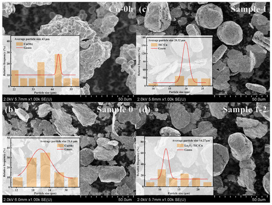 SEM and particle size distribution images of some specimen powders (a) ball-milled 0 h pure Cu powder; (b) ball-milled 6 h pure Cu powder; (c) ball-milled 6 h TiC/Cu composite powder; and (d) ball-milled 6 h TiC-La2O3/Cu composite powder.