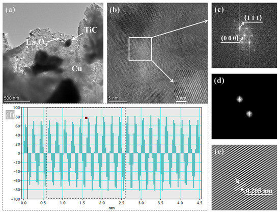 Figure 7 shows the TEM of Sample 1-2 composite powder and the group of processing analysis. Figure 7a A high-resolution TEM of the Sample 1-2 composite powder, which can be represented by bright gray continuous regions for Cu and black blocky regions belonging to TiC. Due to the larger relative mass and smaller particle size of La2O3, it appears as small dark black spots on the TEM image. Figure 7b White box lines were used to identify the selected diffraction regions in the high-resolution TEM image, with local magnification in the lower right corner. The presence of a partially amorphous condition is also observed in the upper right corner of the figure, which is the result of ball milling leading to sufficient energy gain in the composite powder, which in turn transforms to the amorphous state [41,42]. The Fourier transform of the selected area yields the diffractogram Figure 7c, and the masking yields the diffraction spot map with a spacing of 2d Figure 7d. The inverse Fourier transform gives the lattice fringes Figure 7e, and the measurement of crystal spacing on Figure 7f gives dCu(111) = 0.205 nm. Comparison with the standard PDF card data of dCu(111) = 0.208 nm reveals that there is no significant change in d, which indicates that the grain refinement is carried out by physical means such as collision and extrusion, destructive shear, etc., and that the crystal structure is still intact without any distortion.