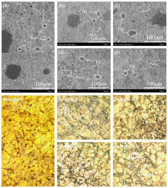 Figure 8 shows the SEM and metallographic specimens of each sample composite. From the SEM and metallography of (a) Sample 0, it can be observed that it has good interfacial bonding, but the distribution of pores is more, and the pore size is larger. This is because the ball milling process changes the matrix grain morphology from near-spherical to flat-spherical and flat-flaky, the stacking efficiency decreases, and a large number of pores appears after sintering. After the introduction of TiC particles, the number of pores and the size of the pore diameter in (b) decreased significantly, but there was agglomeration in the reinforced phase [43]. This is due to the fact that TiC particles are uniformly distributed in the matrix, which can act as heterogeneous nucleation points to promote the exclusion of melt gases during sintering and fill the pores under the applied load, reducing the generation of pores. The number of pores in (c–e) is higher relative to Sample 1, and the pore diameter is also slightly larger. This is due to the fact that the rare earth oxides are prone to reacting with other impurities in the copper matrix to form high melting point compounds, which are unevenly distributed in the molten state of the composite copper liquid, affecting the melting infiltration and solidification process of the composites, and increasing the porosity. Comparatively, it can be observed that Sample 1-1 has the least number of porosities and the smallest pore size, Sample 1-3 is next to it and Sample 1-2 performs the worst. The visualization of the metallographic specimen maps of each sample is consistent with SEM and can be corroborated.