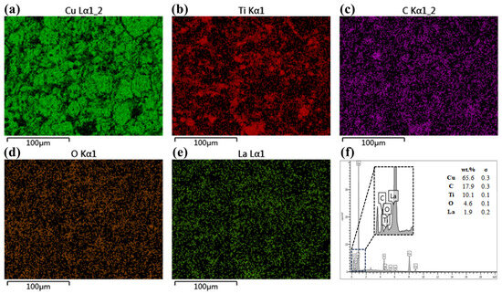 Sample 1-2 composites EDS and mapping (a) Cu; (b) Ti; (c) C; (d) O; (e) La; (f) EDS energy spectra.