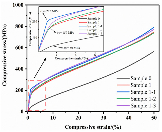 Figure 10 shows the comparative compressive curves of Sample 0, Sample 1, Sample 1-1, Sample 1-2 and Sample 1-3 specimens. It is observed that the compressive strains of each sample are larger, which is due to the excellent ductility of the Cu matrix and the low content of the reinforcing phase, so the material’s deformation ability is good. The yield strength of Sample 0 is low, which is only 50 MPa, and it is increased to 159 MPa after the introduction of the reinforcing phase TiC, and then it is increased twice by the introduction of Re2O3. This is due to the soft texture of the matrix Cu, and the Orowan mechanism of diffusion reinforcement [44,45] works after the introduction of TiC, which effectively prevents the movement and accumulation of dislocations and improves the strength and stability of the composites. Combined with the purifying and de-hybridizing effects of Re2O3 and the strengthening of grain boundaries, the yield strength and stability of the composites are enhanced twice. Observing the yield point details of the enlarged red dashed line, it can be seen that the yield strengths of the composites of Sample 1-1, 1-2, and 1-3 are increased to 213 MPa, 167 MPa, and 185 MPa, respectively, relative to that of Sample 1, Sample 1-1 has the best improvement effect, and the ultimate compressive strength can reach 790 MPa.