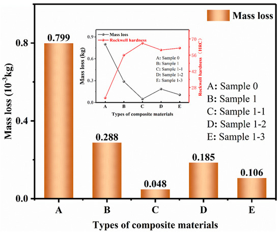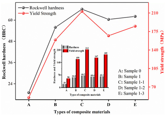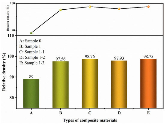 Figure 14 shows the density comparison images of Sample 0, Sample 1, Sample 1-1, Sample 1-2, and Sample 1-3, and the density of Sample 0 is only 89%, which is due to the extrusion, collision, and deformation by mechanical stress, and the powder accumulation is changed from the near-spherical shape with high accumulation efficiency to the flat spherical and flat flake shape with low accumulation efficiency. After sintering, more pores with larger pore size appear, which affects the densification. Combined with Figure 6 and Figure 8, it is found that by adding the reinforcing phase TiC, the reinforcing phase moves and fills the pores under the applied load, and the density of the composites increases to 97.56%. A secondary increase in density occurs with the addition of the second-phase Re2O3. This is due to the effect of rare earth elements in refining the grain and purifying the impurities to reduce the pores and defects caused by the grain size or impurities. At the same time, the effect of strengthening the grain boundary can also improve the densification by improving the interfacial bonding between the reinforcing phase and the Cu matrix.