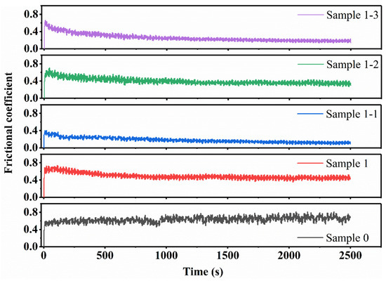 The red curve in Figure 11 represents the change in the yield strength of each specimen and the gray curve represents the change in the Rockwell hardness (HRC) of each specimen. The study shows that the hardness of the pure Cu material is low, the addition of TiC has significantly increased the hardness value, and the continued addition of Re2O3 shows a secondary increase in the hardness change. Combined with Figure 4 this is because the pure Cu material texture is soft, high-energy ball milling resulting in particle morphology from the near-spherical to oblate spherical, oblate flaky transformation, the stacking efficiency decreases, the material porosity increases after sintering, the structure of the loose, easy to slip deformation under the action of the applied load. The reinforcing phase TiC played a role in diffusion reinforcement after addition, effectively hindering the movement and stacking of dislocations, and the strength and mechanical properties of the composites were improved. Continuing to add rare earth oxides, combined with Figure 6, Figure 8 SEM is its role in grain refinement, strengthening the role of grain boundaries, the strength and mechanical properties of the composite material has been enhanced for the second time. Observing the hyperbolic trend and comparing the histogram intuitive data, it can be found that the hardness change in the composite material of each sample is consistent with the change in compressive yield strength, which is consistent with the existing public mechanics research. Figure 12 shows the comparative curves of friction wear variation for Sample 0, Sample 1, Sample 1-1, Sample 1-2, and Sample 1-3. It is observed from the figure that the friction coefficients of all curves show large fluctuations in the initial operation, which is due to the uneven force of the applied load, the specimens are in the stage of adhesive wear [46,47,48], and the fluctuations in the curves are gradually stabilized when the friction layer is formed. As the friction time continues to increase, the average friction coefficient curve stabilizes when the friction time reaches more than 1500 s. The average coefficient of friction decreases from 0.65 for Sample 0 to 0.5 for Sample 1 and continues to decrease to within 0.2 with the addition of Re2O3. It can also be observed from Figure 13 that the wear amount of each sample material is negatively correlated with its hardness change. Combined with Figure 8 metallography, it can be seen that the pure Cu material has more pores and a loose structure, resulting in a high coefficient of friction. The addition of diffusely reinforced TiC particles plays a role in making the composite material wear resistance increase, as well as continuing to add Re2O3 second-phase reinforcement, refine the grain, strengthen the grain boundaries, and fill the pores under the action of the applied load during sintering, which makes the composite material surface smoother and better stability.