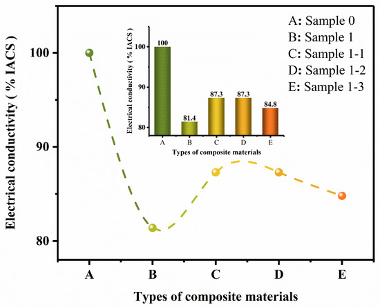 Figure 15 shows the conductivity comparison curves for Sample 0, Sample 1, Sample 1-1, Sample 1-2, and Sample 1-3. Observing the histogram pure Cu data conductivity is not ideal; in conjunction with Figure 4, this is due to the fact that the material is more porous, increasing the probability of electron scattering and the conductivity decreases. With the addition of enhanced phase TiC, conductivity further decreased; this is because the conductivity of TiC and copper conductivity are more different, leading to a decrease in conductivity. Continuing the addition of the second-phase Re2O3 the electrical conductivity rebounded significantly, which is consistent with the findings of the literature [29,30]. This is because the rare earth oxides refine the grain, purification and removal of impurities, improve the role of grain boundaries to reduce the probability of the composite material pores and defects, reduce the probability of electron scattering, and enhance the electrical conductivity of the composite material.