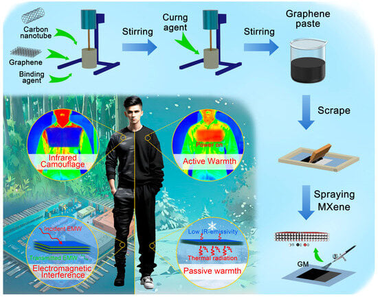 This work reports a practical modified fabric with outstanding electrothermal properties (4 V, 91.7 °C), good electromagnetic shielding properties (64.3 dB), and low IR emissivity (0.248). These properties may be industrialized by basic screen printing and spraying techniques. This study utilized graphene paste, comprising graphene and carbon nanotubes, to act as a transverse thermal conductive layer, uniformly dispersing the heat in the graphene layer and reducing the surface resistance of the fabric. To lower the cloth surface’s IR emissivity, MXene was applied as an IR low-emission layer []. Graphene and MXene coatings were applied to cotton fabric to create graphene/MXene-modified IR stealth fabric. Modified fabrics with excellent heat radiation blocking performance can not only be used to prevent infrared detection but can also be used to make warm clothing so that people in a cold environment can block human body heat emission and achieve passive warmth. They can also be electrically heated to play an active role in warmth. The efficient electromagnetic shielding performance of modified fabrics can help people or objects shield the electromagnetic interference of the surrounding environment, such as pregnant women, workers in complex electromagnetic interference environments, and high-precision instruments. This project aims to develop a novel technique and concept for large-scale creating long-lasting, useful graphene/MXene-modified fabrics with superior IR stealth, electrothermal properties, and electromagnetic shielding qualities. These materials are anticipated to be crucial in developing smart wearables and military applications.