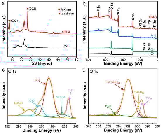 Characterization of graphene/MXene-modified fabrics. (a) XRD spectra of C-1 and GM-3 fabrics; (b) XPS spectra of C-1, G-1, M-1, and GM-3 fabrics; (c,d) C 1s and O 1s high-resolution spectra of GM-3 fabrics.