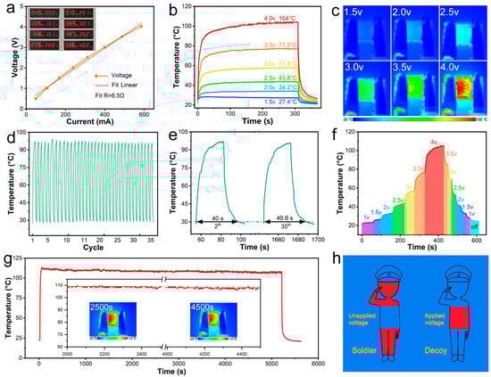Electrothermal properties of graphene/MXene-modified fabrics. (a) V–I linear curve and digital test photos; (b) surface temperature profiles of modified fabrics at different voltages; (c) thermal imaging of modified fabrics at different voltages; (d) stability test curve of modified fabric at 4 V for 35 cycles; (e) cycle 2 and 35th cycle curves in the cyclic stability test curves; (f) curve of saturation radiation temperature change during voltage adjustment; (g) thermostatic stability test curves of modified fabrics connected to a circuit at 4 V (inset shows temperature graphs and thermal images from 2000 s to 2500 s and 4000 s to 4500 s); (h) schematic of thermal camouflage of modified fabrics.