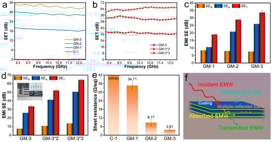 It is well known that for EMI shielding materials, the total EMI SE (SET) is the sum of reflections (SER), absorptions (SEA), and multiple reflections (SEM), and SEM is usually ignored when SEtotal > 15 dB []. As shown in Figure 6c,d, the fabrics’ absorption value (SEA) surpasses their reflection value (SER). This is because when an electromagnetic wave strikes MXene, it undergoes internal reflection, being absorbed and reflected numerous times between MXene sheets, graphene sheets, and MXene and graphene sheets. Significant amounts of electromagnetic wave energy are expended during this process, enhancing the modified fabric’s superior electromagnetic shielding capabilities. Owing to the significant consumption of electromagnetic wave energy during this procedure, the changed fabric performs exceptionally well in electromagnetic shielding. The multilayer MXene-modified fabrics’ surface electromagnetic reflectivity (SER), surface electromagnetic absorption (SEA), and surface electromagnetic transmission (SET) values further demonstrate that while the SER value remains relatively constant, the SEA and SET exhibit a notable rising trend as the number of layers increases. This is because stacking GM-3 fabrics increases the number of MXene and graphene coatings. These flakes increase the number of times electromagnetic waves are absorbed and reflected internally to dissipate energy. This process further improves the electromagnetic shielding capabilities of the MXene-modified fabrics. This is because as the number of layers of GM-3 fabric increases, more MXene and graphene flakes are produced. This increases the number of electromagnetic wave reflections and absorptions and causes the energy generated by these waves to be absorbed. The inset completely illustrates the lightweight and thinness of the graphene/MXene-modified fabric, displaying the three-layer GM-3 fabric’s thickness of only 2 mm.