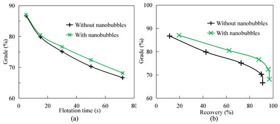 - The nanobubble flotation rate is significantly higher than that of conventional flotation, especially within 15 s of flotation. In addition, the recovery of nanobubble flotation concentrate is significantly higher than that of traditional flotation concentrate, and the final concentrate recovery is about 5 percentage points higher than that of traditional flotation concentrate.