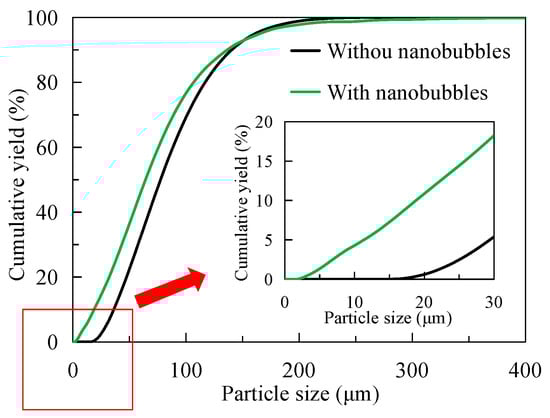 - Nanobubbles promote the agglomeration of fine graphite particles in the pulp, and the average particle size is 13 μm larger than that of the traditional flotation pulp. On the contrary, the particle size of nanobubble flotation concentrate is obviously finer than that of traditional flotation concentrate, and its average particle size is 13 μm smaller than that of traditional flotation concentrate. In addition, the minimum graphite size of nanobubble flotation is only 2 μm, 11 μm smaller than the minimum size of traditional flotation.