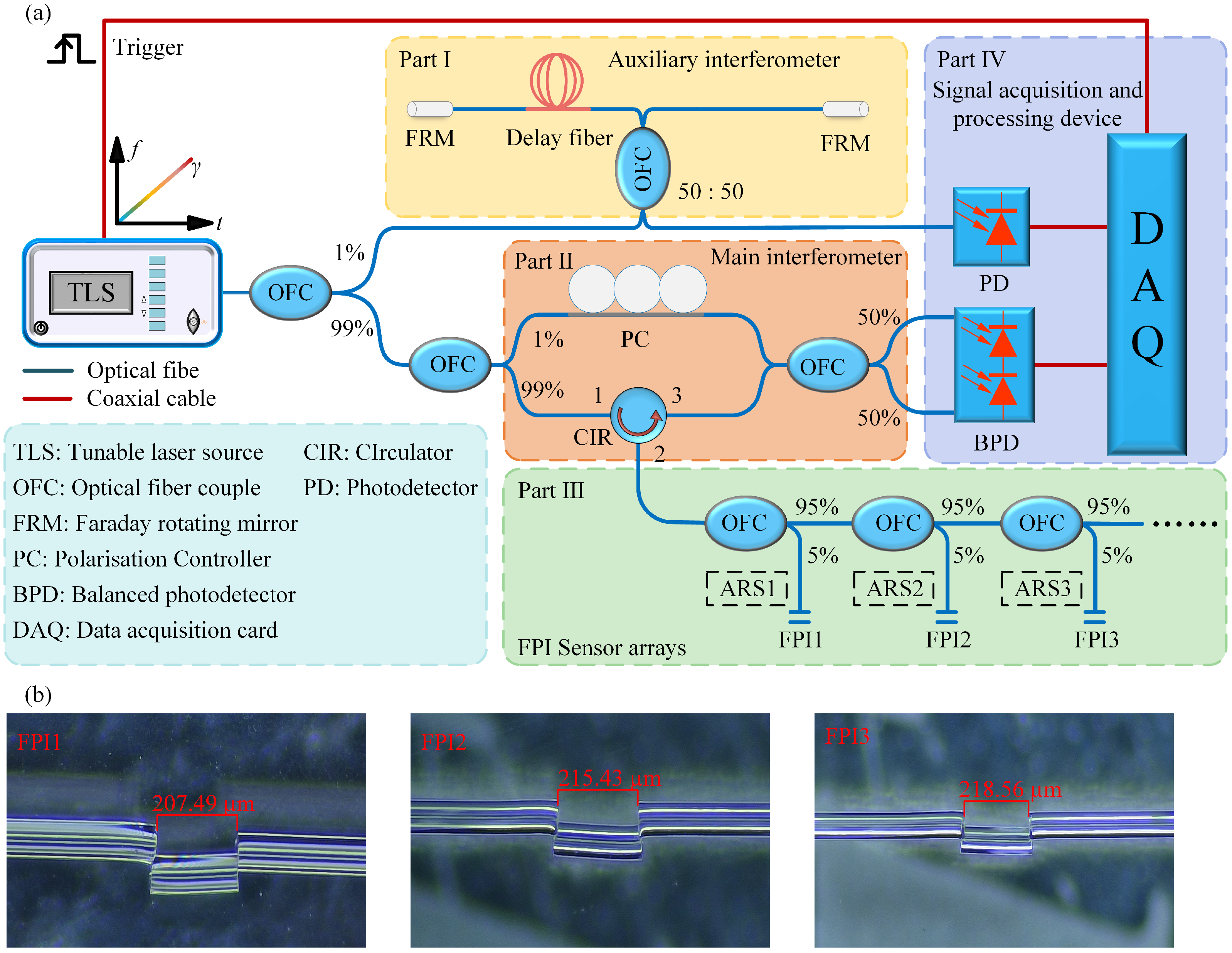 - Liang, C.; Zhou, X.; Wang, Y.; Gao, Y.; Zhang, H.; Jin, B.; Bai, Q. Sensing Distance Enhancement in OFDR Using Multi-Arms Interferometer Phase Noise Compensation Method. J. Light. Technol. 2025, 43, 2371–2378. [Google Scholar] [CrossRef]