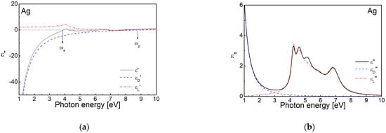 Figure 2 presents the real and imaginary parts of the dielectric function ε of a thin silver film, as well as the Drude and Lorentz components, calculated from the dispersion parameters, published in Ref. [82]. It can be seen that the contribution of the free electrons (i.e., the Drude component, εD′) to the real part, ε′, is always negative and changes its sign at the plasma frequency, ωp. The positive values of the Lorentz component, εL′, lead to an increase in ε′ towards the positive values, and, respectively, towards a change in the sign at a frequency smaller than ωp or the so-called screen plasmon frequency, ωs. At photon energies lower than this needed for interband transitions from the d level, the Drude component, i.e., the contribution of the free electrons, is dominant. The Lorentz component depends weakly on the photon energy at these frequencies and can be considered as a constant.