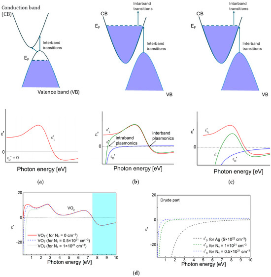 The influence of the materials’ band structure on the complex permittivity is shown in Figure 3a–c. The scheme is valid in the cases of dielectrics, conducting oxides and nitrides with various free electrons’ concentrations, and semimetals. The number of free charge carriers is smaller in semiconductors, which is a reason for the shifting of the plasma frequency towards the lower photon energies, which fall into the infrared (IR) and THz spectral regions. As a consequence, the εD′ curve is also shifted towards the smaller frequencies. A representative case of VO2 [83,84], valid for all semiconductors and conducting oxides, is shown in Figure 3d. It can be seen that at photon energies higher than the resonance frequency for interband transition, the complex permittivity changes its sign and becomes negative—this is the so-called interband plasmonics. A similar effect is observed in the case of semimetals, Bi and Sb, for the near-infrared (NIR) and visible spectral regions [85]. The relatively higher free electron density, Nc up to ~1019–1022 cm−3, increases the contribution of the Drude component in the conducting oxides (ITO, CdO, Al:ZnO (AZO), Ga:ZnO (GZO)) [66,68,86,87] and nitrides (TiN, HfN) [65] and they possess negative values in the IR region in the range 0.5–1.5 eV.