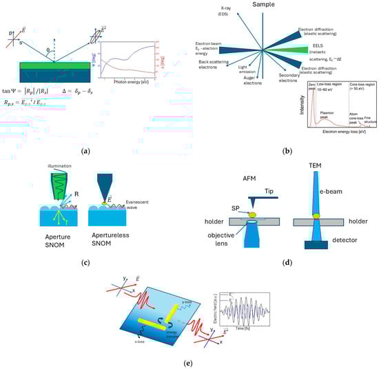 Roadmap of the experimental techniques for the investigation of electronic processes in plasmonic nanostructures: (a) Spectroscopic Ellipsometry; (b) Electron Energy Loss Spectroscopy (EELS); (c) Scattering Near-field Optical Microscopy (SNOM); (d) Single Particle (SP) Spectroscopy, (e) Interferometric and Polarimetric Microscopy.