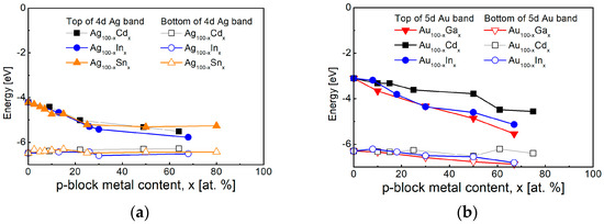 - Nicholson, J.A.; Riley, J.D.; Leckey, R.C.G.; Jenkin, J.G.; Liesegang, J.; Azoulay, J. Ultraviolet photoelectron spectroscopy of the valence bands of some Au alloys. Phys. Rev. B 1978, 18, 2561–2567. [Google Scholar] [CrossRef]