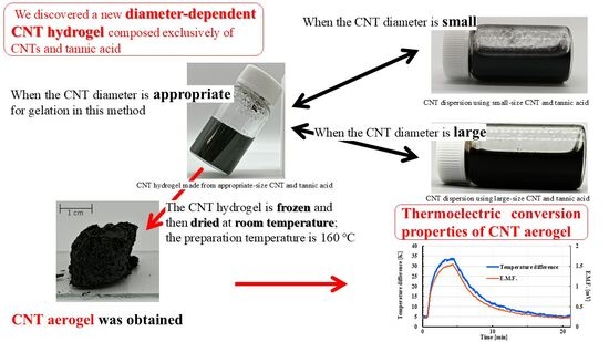 Chicago/Turabian StyleOkubo, Nobuyasu, and Takahide Oya. 2025. "Diameter-Dependent Carbon Nanotube Hydrogel Formed with Tannic Acid and Its Application in Thermoelectric Power Generation" Nanomaterials 15, no. 20: 1556. https://doi.org/10.3390/nano15201556