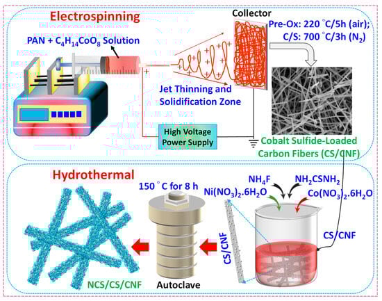 Schematic illustration of the synthesis of NCS/CS/CNF composites via electrospinning of PAN–cobalt acetate precursor, followed by carbonization/sulfurization and subsequent hydrothermal growth of Ni-Co sulfide nanostructures.