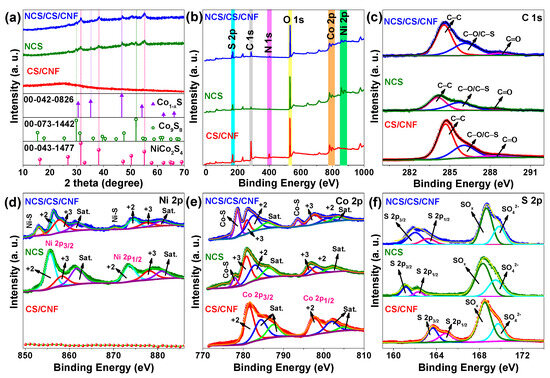 (a) XRD spectra; (b) XPS survey spectra; and (c) C 1s, (d) Ni 2p, (e) Co 2p, and (f) S 2p XPS spectra of CS/CNF, NCS, and NCS/CS/CNF samples.