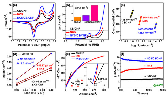 OER performance of CS/CNF, NCS, and NCS/CS/CNF electrodes in 1 M KOH: (a) CV curves at 20 mV s−1, (b) LSV profiles, (c) Tafel slopes, (d) areal capacitance derived from CV, (e) Nyquist plots with equivalent circuit model, and (f) chronoamperometry stability at 0.65 V for 5 h.