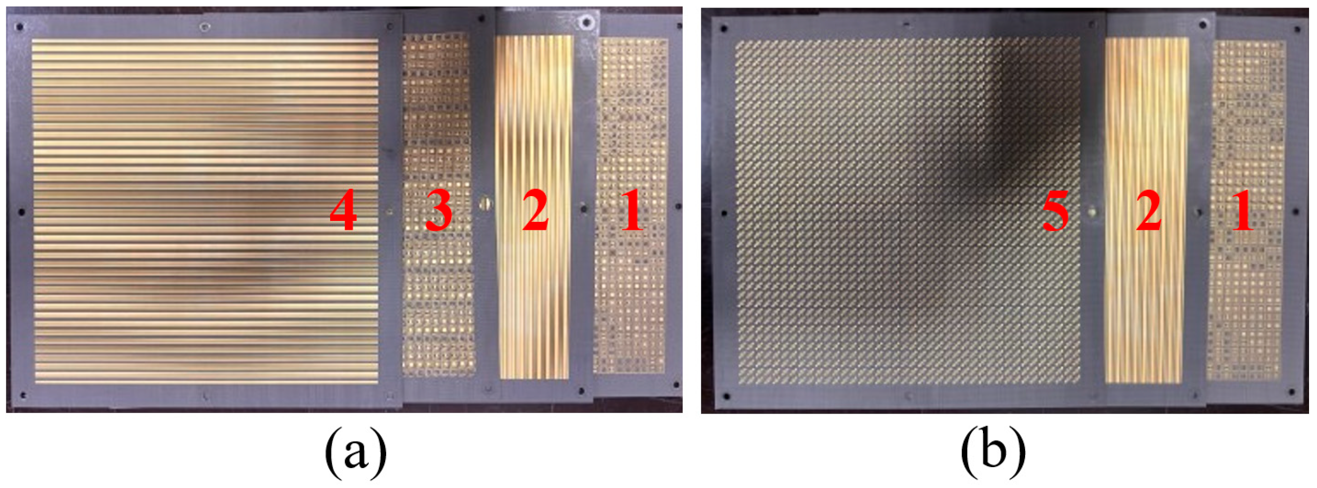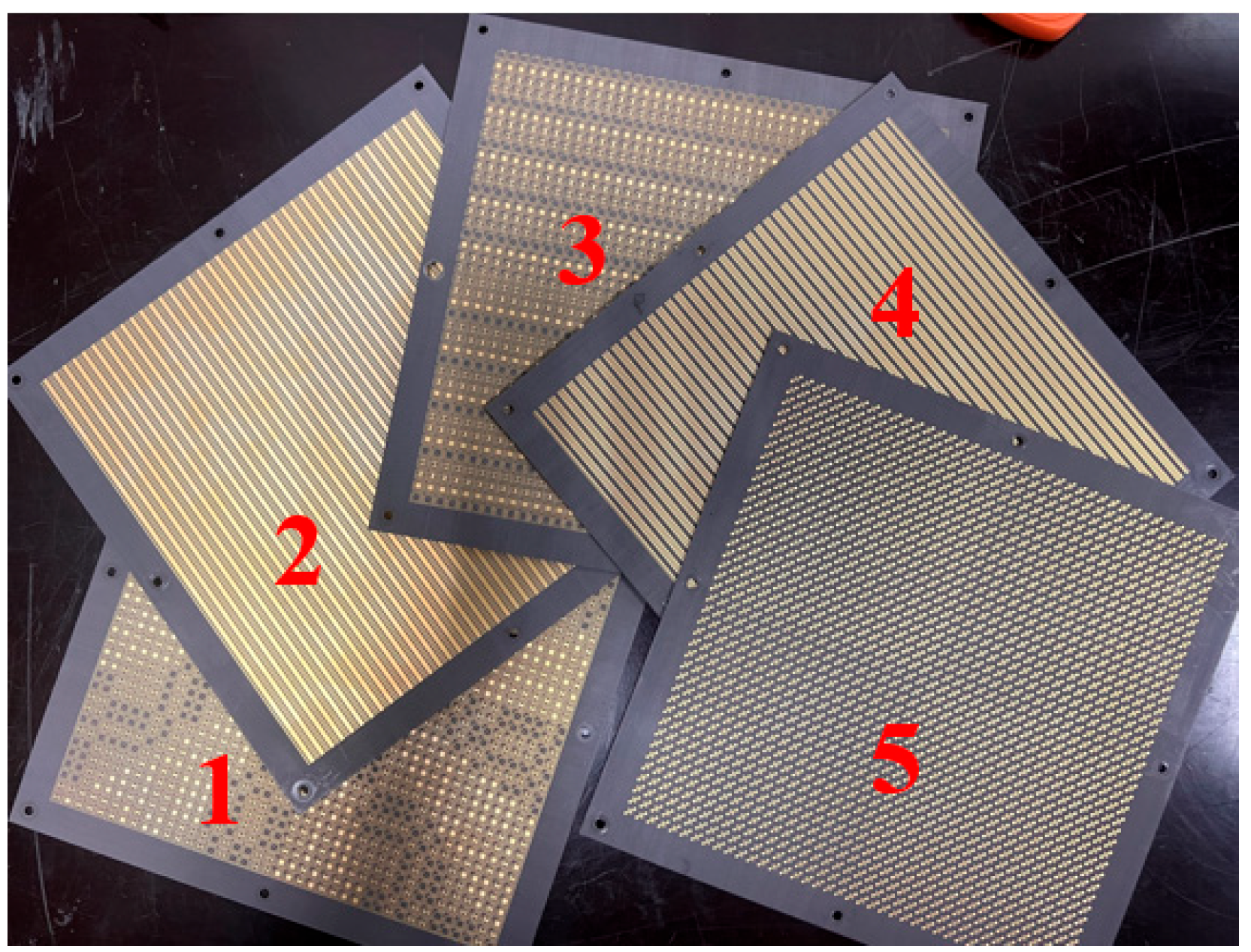 As shown in Figure 16, five metasurface prototypes are fabricated using PCB manufacturing processes according to the designed phase encoding schemes. Each metasurface measures 170 mm × 170 mm with eight 3 mm-diameter through-holes at the edges for cascaded mounting on custom fixtures. Specifically, the 1st and 3rd layers feature double-sided copper structures with grating layers on the back and phase encoding layers on the front; the 2nd and 4th layers are single-sided copper structures corresponding to different grating designs; and the 5th layer is a double-sided copper structure with a grating layer on the back and a polarization conversion layer on the front.