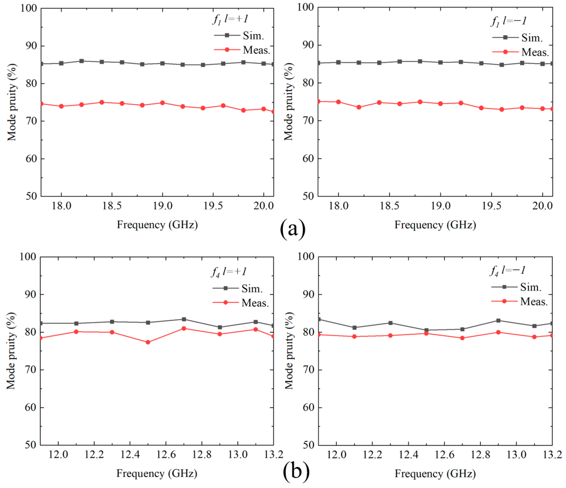 Figure 20. Mode purity analysis of OAM beams generated by two functional configurations. (a) Function f1 (14–20.7 GHz). (b) Function f4 (11.9–13.2 GHz).