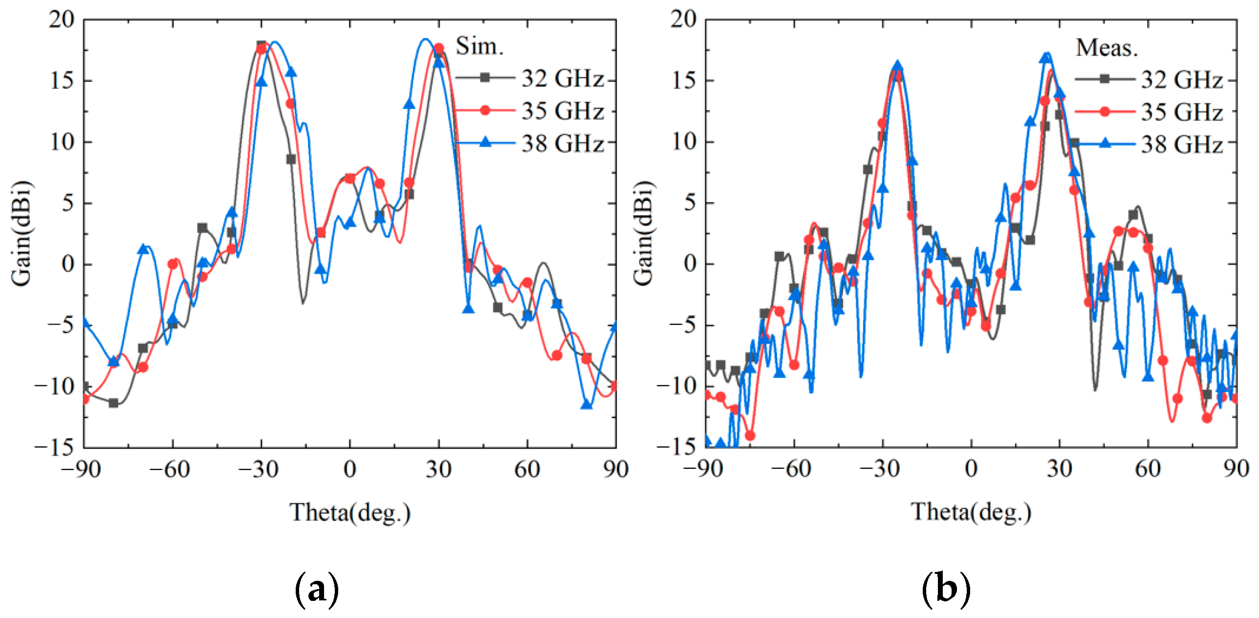 The simulation and experimental results for the reflected dual-beam function are presented in Figure 22. To thoroughly validate the stability of this function across the entire operating frequency band, two edge frequencies at 32 GHz and 38 GHz, along with the center frequency at 35 GHz within the frequency band, are selected as representative frequency points for analysis. The results demonstrate excellent consistency between simulation and experimental data. The two symmetric beams appear precisely at azimuth angles of ±30°, fully conforming to the design expectations. The simulation results show that the peak gains of the two symmetric beams vary within the range of 17.41–18.47 dBi, while the corresponding experimental results exhibit peak gains ranging from 15.58 to 16.79 dBi, with a deviation of approximately 1.7 dBi from the simulation results. As frequency increases, the gain shows an increasing trend while the beam steering angles slightly decrease, which is a normal phenomenon attributed to the inherent dispersive characteristics of the metasurface structure. The experimental results fully validate that the cascaded structure can generate reflected dual beams in the −z half-space within the Ka-band, confirming the effectiveness and practicality of the design approach.