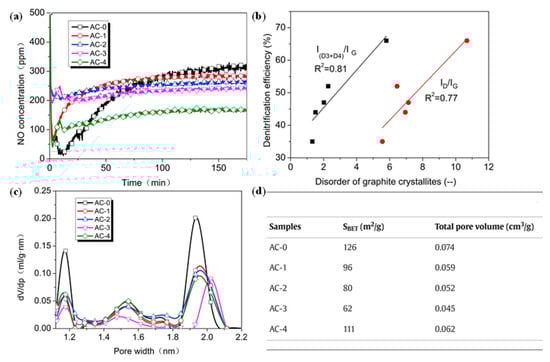 (a) Breakthrough curves for NO concentration on various AC samples; (b) effects of the disorder of graphite crystallites on denitrification efficiency; (c) pore size distribution on various AC samples; (d) specific surface area and total pore volume of AC samples [].