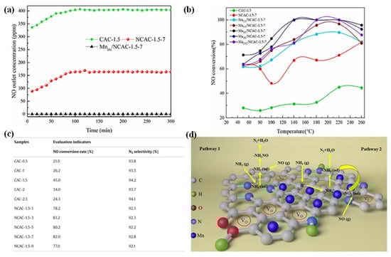 (a) NO concentration variation curves for different samples at the reaction temperature of 180 °C; (b) steady-state NO conversions at different temperatures; (c) NO conversion and N2 selectivity of cotton stalk biochar and nitrogen-doped cotton stalk carbon; (d) a schematic diagram of the reaction mechanism of Mn-modified nitriding cotton stalk biochar [].