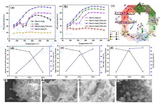 (a,b) NOx conversion; (c) promoting effect of N, S co-doped over Mn-Ce-SnOx/NSG-0.3 in L-H mechanism; (d–f) relationship between Ce3+/(Ce3+ + Ce4+), Mn4+/Mn3+, Oα/(Oα + Oβ), and Ea over Mn-Ce-SnOx/NSG-0.3; (g–j) FESEM images of Mn-Ce-SnOx/G and Mn-Ce-SnOx/NSG-X (X = 0.2, 0.3, and 0.4) [].