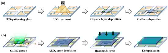 (a) Fabrication and (b) encapsulation processes of OLED devices.