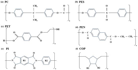 Chemical structure of polymer films: (a) PC, (b) PES, (c) PET, (d) PEN, (e) PI, (f) COP.
