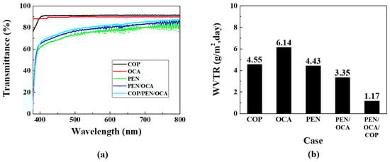 First, it is necessary to verify the mechanical properties before applying the selected polymer films to the OLED device. Figure 3a presents the transmittance data for single layers of COP, PEN, and OCA films, including those for multilayer structures. The OCA film was utilized to attach the non-adhesive PEN film to the OLED device. The COP and OCA films exhibit high transmittance (approximately 91% and 90%, respectively), while the PEN film shows only approximately 80% transmittance in the visible light region. This characteristic also influences any multilayer structure containing the PEN film. The PEN film’s haziness is attributed to its molecular structure, which contains naphthalene rings [32,33,34]. These rings increase crystallinity, resulting in more significant differences in refractive index between crystalline grains and amorphous regions, which causes light scattering and reduced transparency. In addition, rapid cooling during film manufacturing can also cause refractive index inhomogeneity and light scattering. Although this haze phenomenon can be mitigated, as demonstrated by previous studies [35], we selected the PEN film as the barrier layer, prioritizing its oxygen and WVTR rates, while considering its transmittance performance.