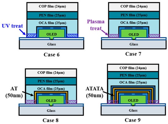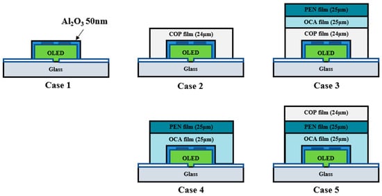 Case 3 models the structure with PEN/OCA attached over the COP film. Cases 2 and 3 enable a direct comparative analysis of lifetime test results based on the presence or absence of the PEN/OCA film. Case 4 features a structure with a PEN/OCA film attached directly over the Al2O3 thin film. This allows comparison of the barrier performance between the COP and PEN/OCA films when compared to Case 2.