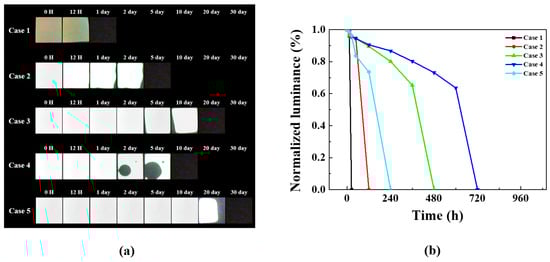 Figure 5b shows the luminance changes of all devices over time in a graph. Figure 5b reveals a sudden performance degradation in all devices. Dark spots appeared on all devices before complete degradation occurred. The observation of dark spots indicates the step where moisture and oxygen permeate and contact the organic layer. The organic layer, upon contact with moisture and oxygen, rapidly degrades, causing dark spots and ultimately leading to degradation. Furthermore, the reason each device exhibits a different rate of performance degradation is due to the differing encapsulation layer structures applied to each device. The encapsulation layer applied in Case 1 was a single-layer Al2O3 thin film without an additional barrier layer, leading to complete degradation after 12 h. The encapsulation layers applied in Cases 2–5 featured a multilayer structure of inorganic and polymer films, capable of suppressing diffusion even if moisture and oxygen permeate. This explains why the rate of performance degradation differed across each device.