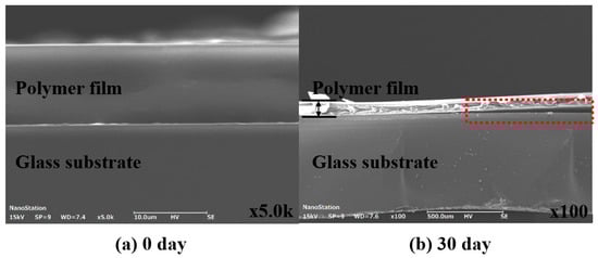 Figure 6 presents SEM images of the cross-section before and after 30 days of Case 5’s life test. Figure 6a illustrates the pre-test cross-section, confirming that the interface between the polymer film and the glass substrate is fully adhered, which indicates no deformation during the heat pressing encapsulation process. Figure 6b shows the cross-section after the 30-day life test (at 60 °C and 90% humidity), revealing delamination between the polymer film and the glass substrate. This delamination is attributed to the permeation of moisture and oxygen over time, which reduced the adhesive strength. Consequently, the adhesive strength was further verified over the life test duration to highlight the cause.