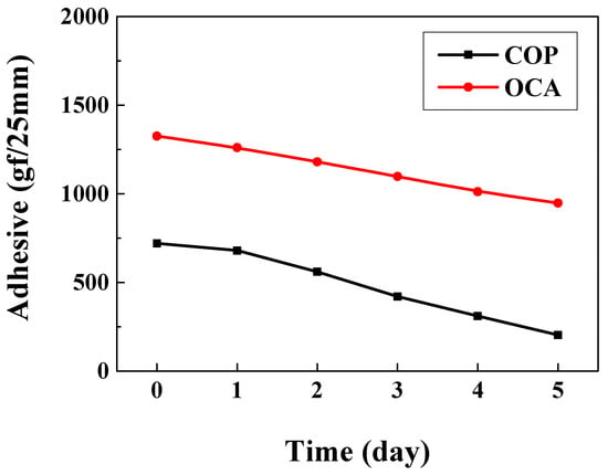 To compare adhesion strength over time during the lifespan test, adhesion was measured according to the ASTM D3330 standard [37]. A 90° peel test was performed after attaching COP and OCA films to a steel use stainless (SUS) substrate. Because simple roll lamination yielded a significantly low adhesion force (101.9 gf/25 mm) for the COP film, a thermal compression process (80 °C, 300 MPa) was conducted instead. Similarly, the OCA film was attached via thermal compression to simulate its application as an encapsulation layer on an OLED device. The samples were placed in a constant temperature and humidity chamber (60 °C, 90% humidity) to analyze alterations in adhesion strength over the life test period. OCA’s initial adhesion (1325.6 gf/25 mm) decreased to 948 gf/25 mm over time. COP’s initial adhesion (720.4 gf/25 mm) decreased significantly to 203.9 gf/25 mm after 5 days (Figure 7). These results suggest that the film’s adhesive components undergo hydrolysis or weakening under harsh conditions [38]. Hence, enhancing adhesion is necessary to improve OLED device lifespan. Among various approaches, we analyze the effects of UV or plasma treatment as potential improvement strategies.