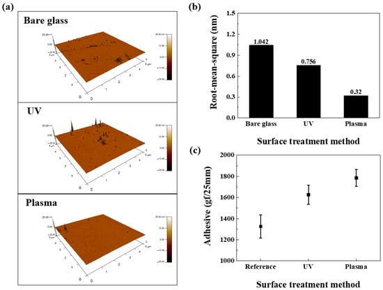 Figure 8 illustrates data measuring surface roughness alterations after UV or plasma treatment is applied to a glass substrate. Figure 8a presents 3D scanning images measured utilizing an AFM instrument, comparing bare (untreated), UV-treated, and plasma-treated glass substrates. Based on these images, Figure 8b illustrates the root-mean-square (RMS) roughness alterations by the surface treatment method (STM). The UV-treated substrate’s RMS is 0.756 nm (a 37.8% improvement over bare glass). The plasma-treated substrate’s RMS is 0.32 nm (a 69.3% improvement). When surface modification is performed, there is a tendency for the RMS to generally decrease with surface modification, with plasma treatment exhibiting the highest improvement rate. The decrease in RMS is attributed to the breaking of chemical bonds in organic molecules, thereby discarding impurities [39,40,41]. Plasma treatment can modify the glass substrate surface without damage, making it suitable for use on the ITO glass substrate of OLED devices. However, to prevent damage to the OLED’s organic layer, a mask is utilized during treatment, ensuring surface modification occurs only where the polymer film is attached. Additional analysis was conducted on the surfaces of these treated substrates.