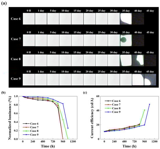 Figure 10c shows the current efficiency graph over time during reliability testing. Generally, the current efficiency of all devices exhibits an upward trend, as the rate of current decrease is greater than the rate of luminance decrease. The reason for the greater current decay rate is multifaceted, but over time, dark spots and locally shorted areas within the light-emitting region can cause the overall current to decrease [45,46]. The initial current efficiency of all devices was similar at 10.7 cd/A. At 1080 h, Case 9 exhibited the highest measured current efficiency at 48.8 cd/A.