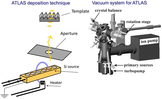 In this technique, an electric field is generated by applying a high voltage between the substrate and the target, which propels Si ions in the direction of the substrate surface. The high voltage electric field plays a role in determining the directionality and energy of the incoming species and hence the shadowing effect and the film morphology. Background pressure of 2 × 10−6 mbar at deposition was maintained using a turbomolecular pump (HiPace 300, Pfeiffer Vacuum GmbH, Aßlar, Germany) with a backing dry scroll pump (nXDS10i, Edwards Vacuum, Crawley, UK), and an ion pump (StarCell, Gamma Vacuum, Shakopee, MN, USA) for steadiness.