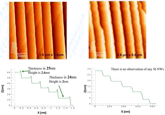 AFM evidence for the thermal evolution of Si nanowire arrays on faceted Al2O3(0001). Representative AFM images at different scan sizes (top) show parallel nanowire features, with line profiles (bottom) indicating thickness and height variations. No isolated SiNWs were observed at this stage.